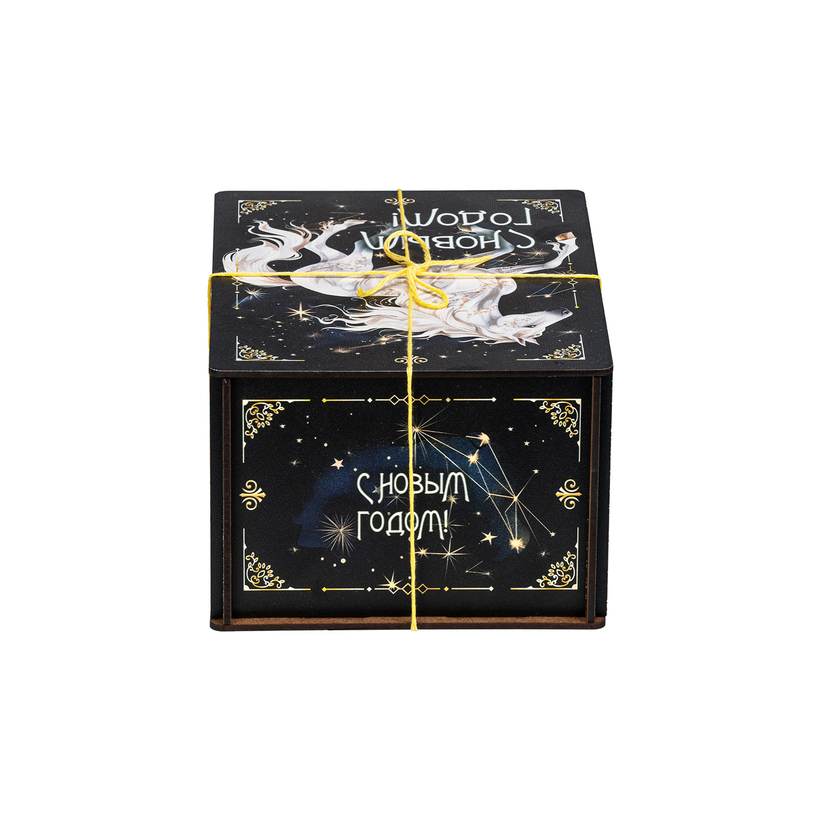 Новогодние сладкие подарки с изображением символа наступающего года всегда пользуются спросом! “Созвездие коня” - это конфетный набор, помещенный в небольшой деревянный ящичек. Упаковка оформлена в темные тона, разбавленные небольшими контрастными элементами: яркой веревочкой, небольшими орнаментами и поздравительными надписями. На крышке подарка находится большое изображение символа наступающего года - белоснежного благородного коня, который словно парит по ночному небу. За счет такого исполнения подарок подойдет для вручения подростку или взрослому. В состав набора входят вкусные сладости и небольшой памятный сувенир в виде символа 2026 года.